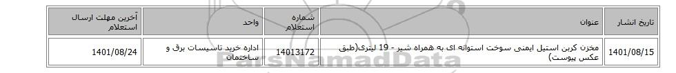 | 1401/08/15 | مخزن کربن استیل ایمنی سوخت استوانه ای به همراه شیر - 19 لیتری(طبق عکس پیوست) | 14013172 | اداره خرید تاسیسات برق و ساختمان | 1401/08/24 |