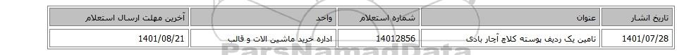 | 1401/07/28 | تامین یک ردیف پوسته کلاچ آچار بادی | 14012856 | اداره خرید ماشین الات و قالب | 1401/08/21 |