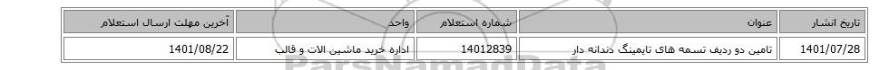 | 1401/07/28 | تامین دو ردیف تسمه های تایمینگ دندانه دار | 14012839 | اداره خرید ماشین الات و قالب | 1401/08/22 |