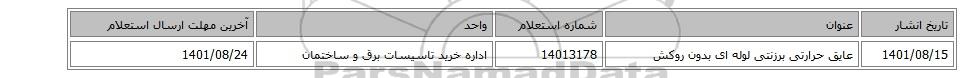 | 1401/08/15 | عایق حرارتی برزنتی لوله ای بدون روکش | 14013178 | اداره خرید تاسیسات برق و ساختمان | 1401/08/24 |