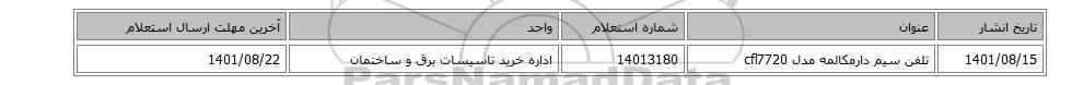 | 1401/08/15 | تلفن سیم دارمکالمه مدل cfl7720 | 14013180 | اداره خرید تاسیسات برق و ساختمان | 1401/08/22 |