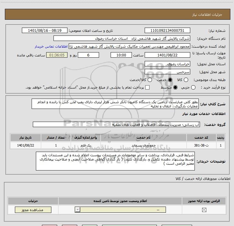 شرح کلی نیاز: بطور کلی عبارتست ازتامین یک دستگاه کامیون تانکر شش هزار لیتری دارای پمپ لجن کش با راننده و انجام عملیات بارگیری ، انتقال و تخلیه