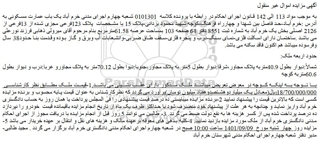 با توجه به اینکه کوچه در معرض تعریض میباشد ملک مذکور دارای عقب نشینی می باشد.1-قیمت ملک مطابق نظر کارشناسی 18/700/000/000ریال(معادل یک میلیاردوهشتصدوهفتاد میلیون تومان)برآورد می گردد که نظرکارشناس به عنوان قیمت پایه محسوب و برنده مزایده کسی است که بالاترین قیمت را پیشنهاد نمایید 2-برنده مزایده میبایستی ده درصد قیمت پیشنهادی را فی المجلس پرداخت یا همان روز به حساب دادگستری خرم آباد واریز نماید و چنانچه به هر علت از پیشنهاد خود منصرف شود یا حداکثر ظرف یک ماه از تاریخ انجام مزایده باقیمانده قیمت خودرو را نپردازد ده درصد پرداخت شده پس از کسر هزینه ها به نفع دولت ضبط می گردد. 3- طالبین می توانند 5 روز قبل از انجام مزایده با دریافت مجوز از اجرای احکام مدنی دادگستری خرم آباد از ملک مورد مزایده بازدید نمایید. 4-کلیه بدهی های معوقه برعهده مالک و هزینه های نقل و انتقال بر عهده خریدار می باشد 5- مزایده روز چهار شنبه مورخ 1401/09/09 ساعت 10:00 صبح در شعبه چهارم اجرای احکام مدنی دادگستری خرم آباد برگزار می گردد . مجید طالبی-مدیر دفتر شعبه چهارم اجرای احکام مدنی شهرستان خرم آباد