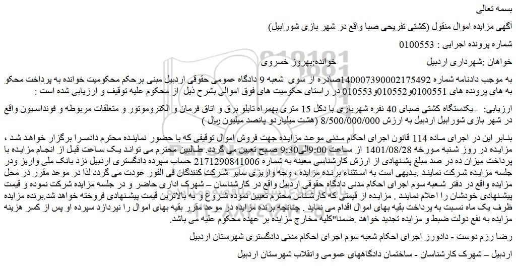 آگهی مزایده اموال منقول (کشتی تفریحی صبا واقع در شهر بازی شورابیل)