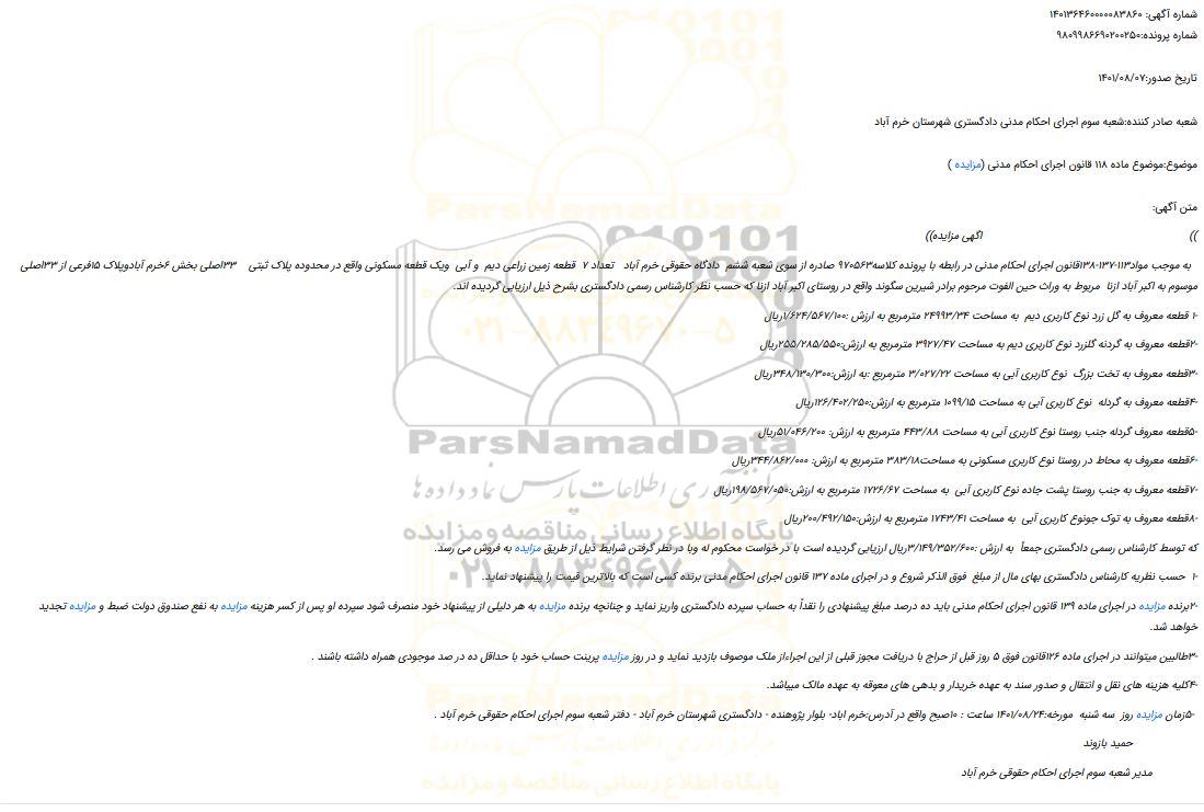 به موجب مواد113-137-138قانون اجرای احکام مدنی در رابطه با پرونده کلاسه970563 صادره از سوی شعبه ششم دادگاه حقوقی خرم آباد تعداد 7 قطعه زمین زراعی دیم و آبی ویک قطعه مسکونی واقع در محدوده پلاک ثبتی 33اصلی بخش 6خرم آبادوپلاک 15فرعی از 33اصلی موسوم به اکبر آباد ازنا مربوط به وراث حین الفوت مرحوم برادر شیرین سگوند واقع در روستای اکبر آباد ازنا که حسب نظر کارشناس رسمی دادگستری بشرح ذیل ارزیابی گردیده اند.