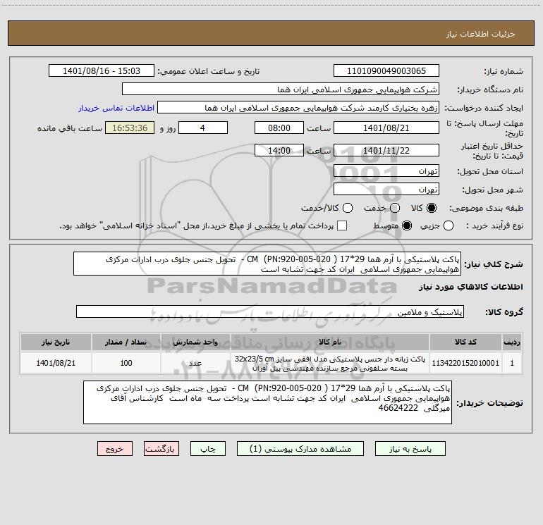 شرح کلی نیاز: پاکت پلاستیکی با آرم هما 29*17 ( CM (PN:920-005-020 - تحویل جنس جلوی درب ادارات مرکزی هواپیمایی جمهوری اسلامی ایران کد جهت تشابه است