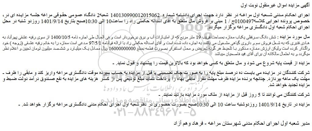 - مزایده در تاریخ 1401/9/14 روزدوشنبه ساعت 10 الی 10:30صبح بصورت حضوری در دفترشعبه اول اجرای احکام مدنی دادگستری مراغه برگزار خواهد شد.