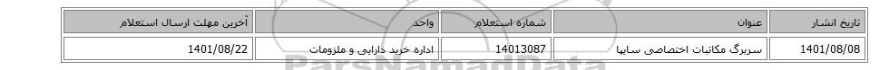 1401/08/08سربرگ مکاتبات اختصاصی سایپا14013087اداره خرید دارایی و ملزومات1401/08/22