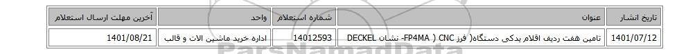| 1401/07/12 | تامین هفت ردیف اقلام یدکی دستگاه( فرز FP4MA ) CNC- نشان DECKEL | 14012593 | اداره خرید ماشین الات و قالب | 1401/08/21 |