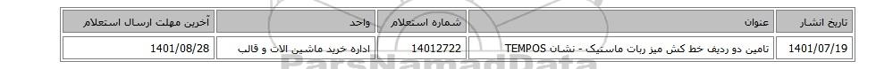 | 1401/07/19 | تامین دو ردیف خط کش میز ربات ماستیک - نشان TEMPOS | 14012722 | اداره خرید ماشین الات و قالب | 1401/08/28 |