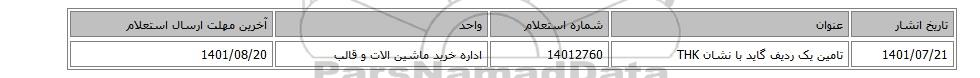 | 1401/07/21 | تامین یک ردیف گاید با نشان THK | 14012760 | اداره خرید ماشین الات و قالب | 1401/08/20 |