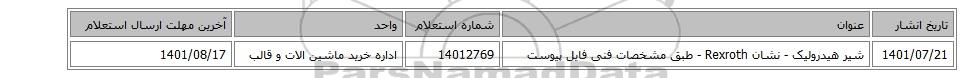 | 1401/07/21 | شیر هیدرولیک - نشان Rexroth - طبق مشخصات فنی فایل پیوست | 14012769 | اداره خرید ماشین الات و قالب | 1401/08/17 |