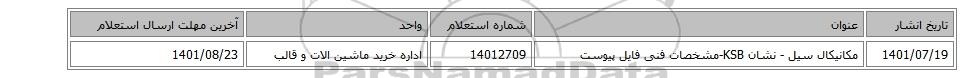 | 1401/07/19 | مکانیکال سیل - نشان KSB-مشخصات فنی فایل پیوست | 14012709 | اداره خرید ماشین الات و قالب | 1401/08/23 |