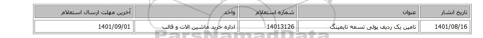 | 1401/08/16 | تامین یک ردیف پولی تسمه تایمینگ | 14013126 | اداره خرید ماشین الات و قالب | 1401/09/01 |