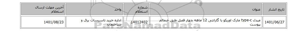 | 1401/06/27 | مبدل type-c مارک اوریکو با گارانتی 12 ماهه چهار فصل طبق ضمائم پیوست | 14012402 | اداره خرید تاسیسات برق و ساختمان | 1401/08/23 |