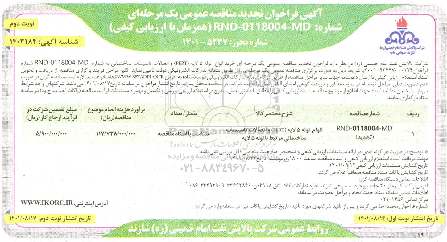 شرکت پالایش نفت امام خمینی (ره) در نظر دارد فراخوان تجدید مناقصه عمومی یک مرحله ای خرید انواع لوله 5 لایه (PERT) و اتصالات تاسیسات ساختمانی به شماره RND - 0118004 - MD و شماره فراخوان 2001092447000174 با شرایط ذیل به صورت برگزاری مناقصه عمومی یک مرحله ای را از طریق سامانه تدارکات الکترونیکی دولت تامین نماید. کلیه مراحل فرآیند مناقصه از دریافت و تحویل اسناد استعلام ارزیابی کیفی تا ارسال دعوتنامه جهت سایر مراحل مناقصه از طریق درگاه سامانه تدارکات الکترونیکی دولت ستاد به آدرس ستاد ایران انجام خواهد شد. لازم است مناقصه گران در صورت عدم عضویت قبلی مراحل ثبت نام در سایت مذکور و دریافت گواهی امضای الکترونیکی را جهت شرکت در مناقصه محقق سازند. تاریخ انتشار فراخوان در سامانه تاریخ 1401.8.17 می باشد. شرکت های واجد شرایط می بایست ضمن مطالعه اسناد جهت اطلاع از موضوع مناقصه، اسناد ارزیابی کیفی را مطابق با دستورالعمل مندرج در استعلام ارزیابی کیفی بررسی و تکمیل و به همراه مستندات فرآیند مناقصه (پاکات الف، ب ، ج و د) در سامانه ستاد بارگذاری نمایند.