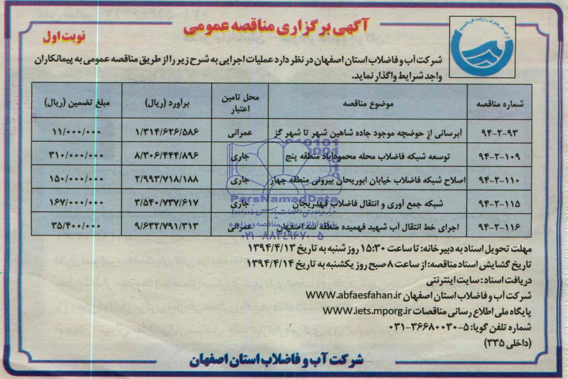 | 116-2-94 | اجرای خط انتقال آب شهید فهمیده منطقه سه اصفهان | عمرانی | 9.632.791.313 | 35.400.000 |