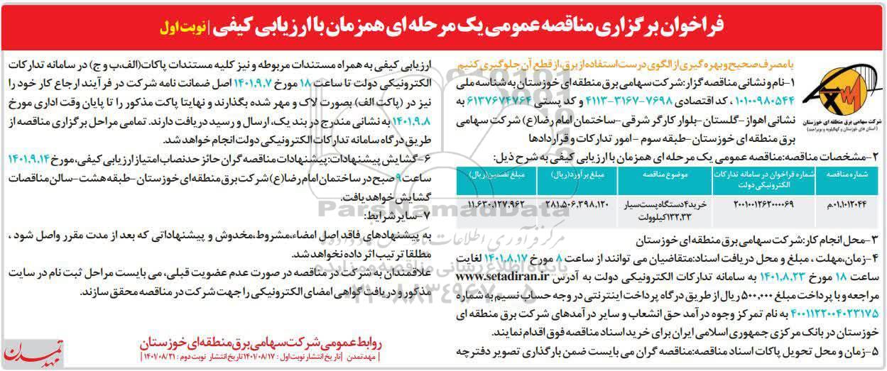 | 01/1012044 / م | 2001001262000069 | خرید 4 دستگاه پست سیار 132/33 کیلوولت | 281.506.398.120 | 11.630.127.962 |