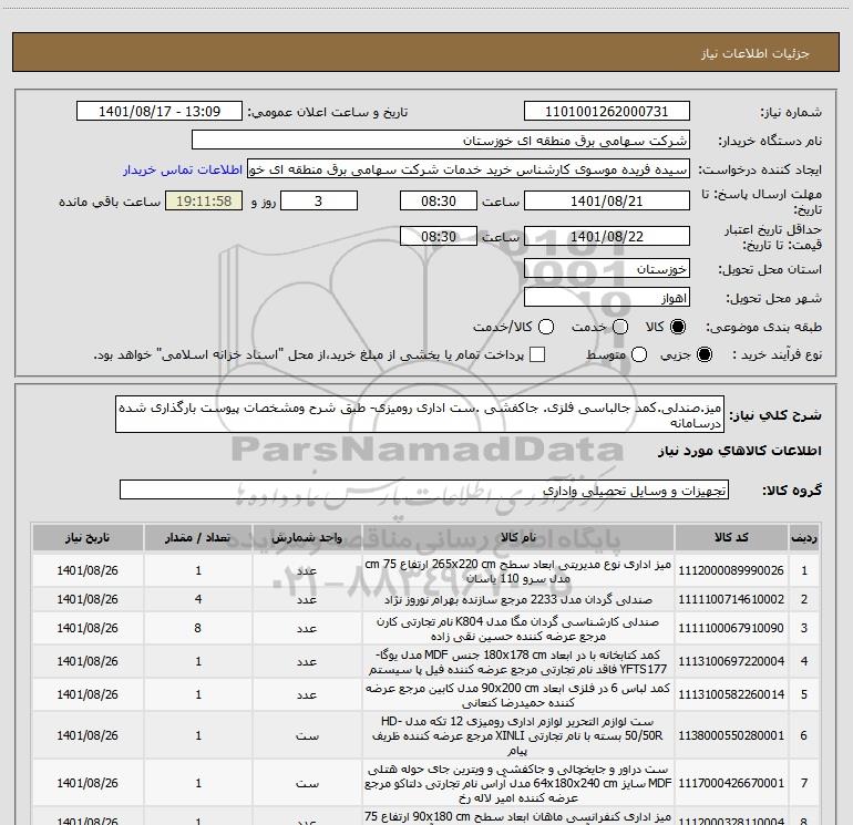 استعلام میز.صندلی.کمد جالباسی فلزی. جاکفشی .ست اداری رومیزی- طبق شرح ومشخصات پیوست بارگذاری شده درسامانه, استعلام میز.صندلی.کمد جالباسی فلزی. جاکفشی .ست اداری رومیزی- طبق شرح ومشخصات پیوست بارگذاری شده درسامانه
