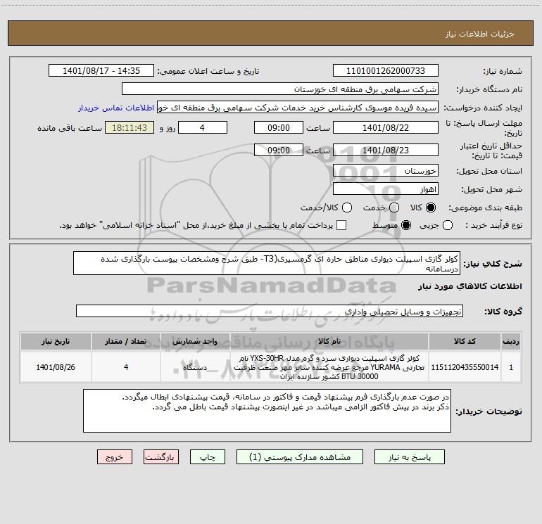 شرح کلی نیاز: کولر گازی اسپیلت دیواری مناطق حاره ای گرمسیری(T3- طبق شرح ومشخصات پیوست بارگذاری شده درسامانه