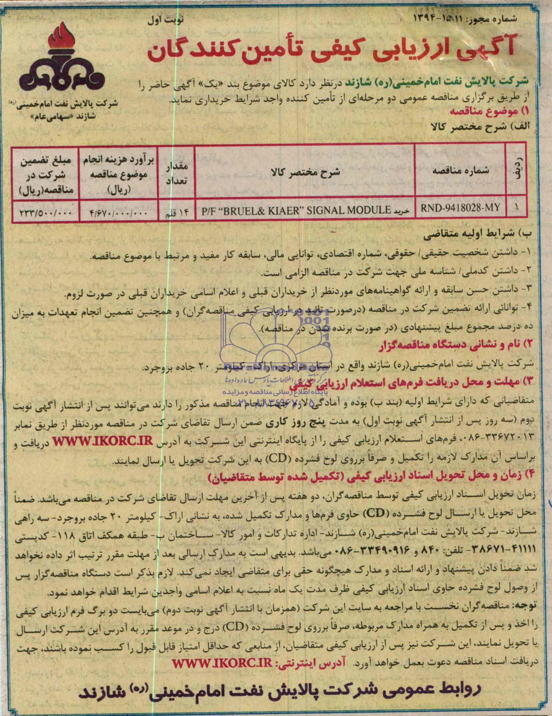 مناقصه خرید P/F BRUEL & KIAER SIGNAL MODULE , آگهی ارزیابی کیفی تامین کنندگان , مناقصه خرید P/F BRUEL & KIAER SIGNAL MODULE