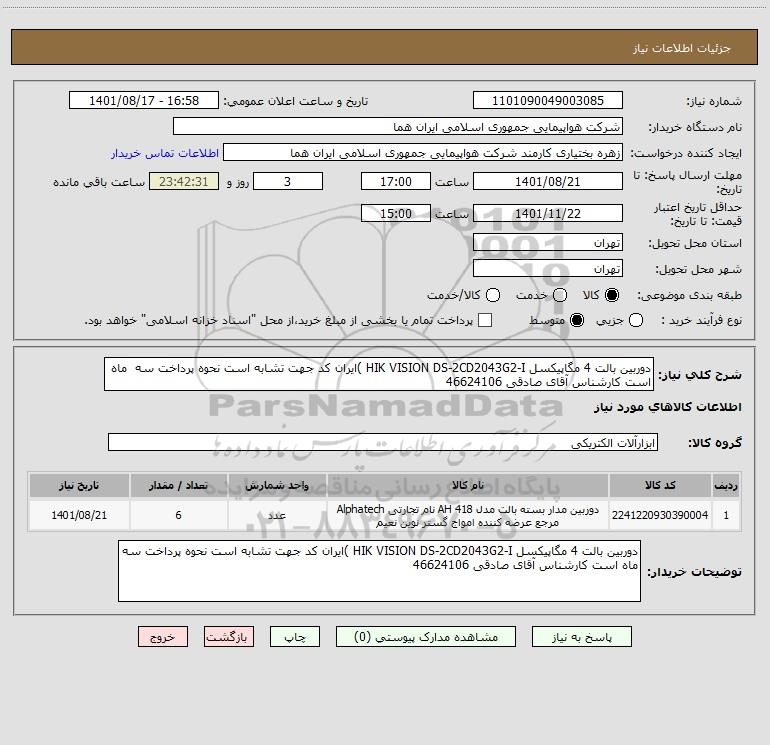 شرح کلی نیاز: دوربین بالت 4 مگاپیکسل HIK VISION DS-2CD2043G2-I )ایران کد جهت تشابه است نحوه پرداخت سه ماه است کارشناس آقای صادقی 46624106