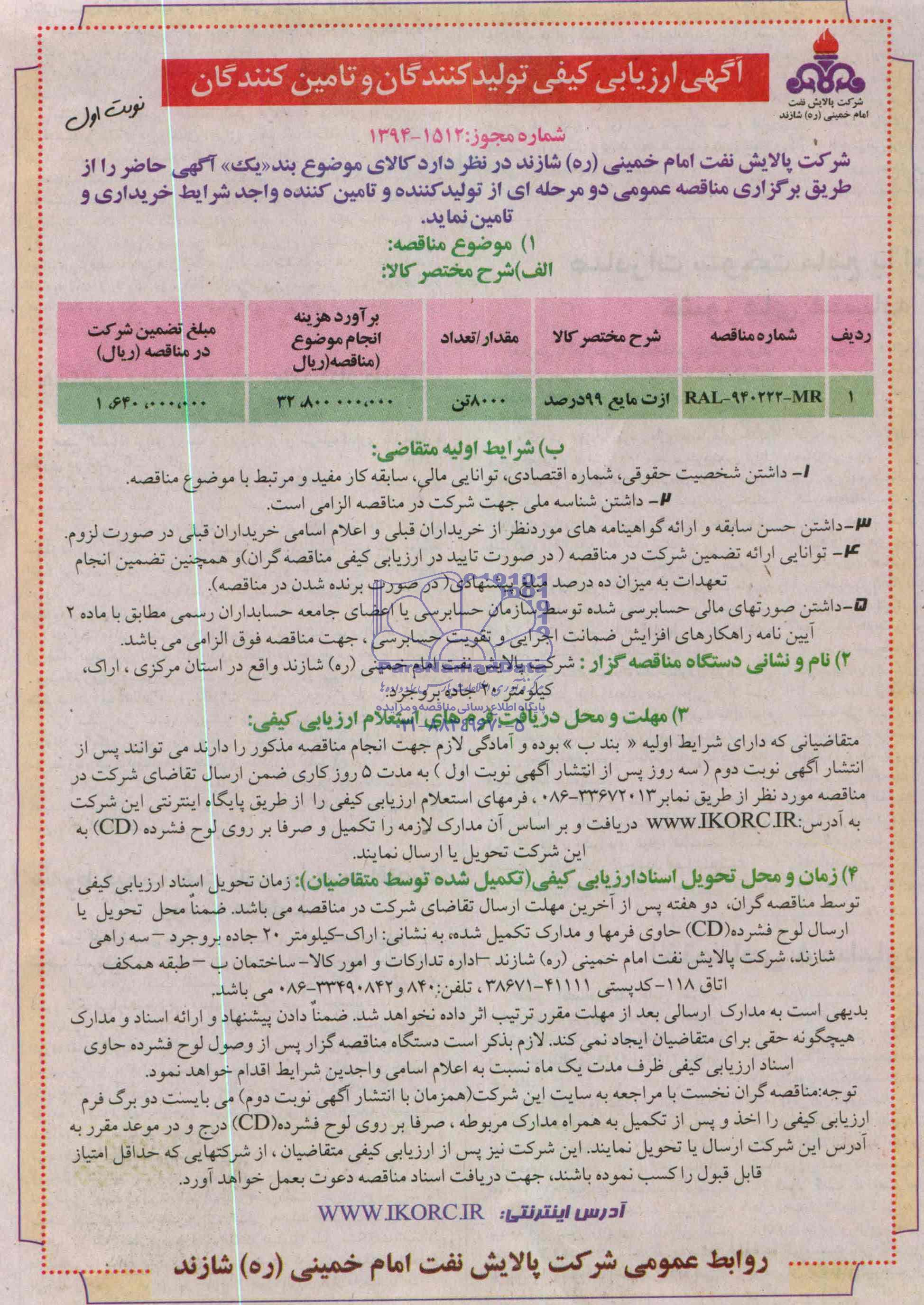 نام و نشانی دستگاه مناقصه گزار: شرکت پالایش نفت امام خمینی (ره) شازند واقع در استان مرکزی، اراک، کیلومتر 20 جاده بروجرد