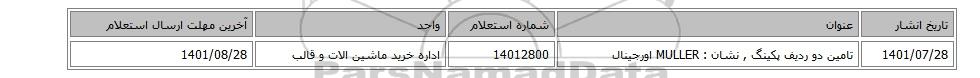 | 1401/07/28 | تامین دو ردیف پکینگ , نشان : MULLER اورجینال | 14012800 | اداره خرید ماشین الات و قالب | 1401/08/28 |