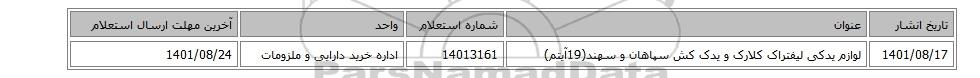 | 1401/08/17 | لوازم یدکی لیفتراک کلارک و یدک کش سپاهان و سهند(19آیتم) | 14013161 | اداره خرید دارایی و ملزومات | 1401/08/24 |