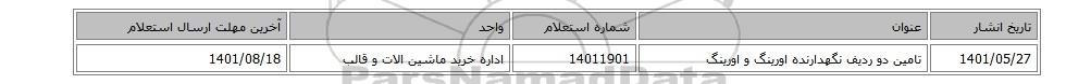 | 1401/05/27 | تامین دو ردیف نگهدارنده اورینگ و اورینگ | 14011901 | اداره خرید ماشین الات و قالب | 1401/08/18 |