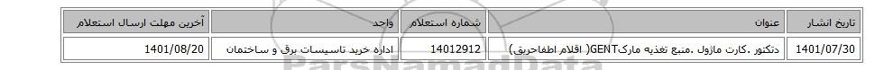 | 1401/07/30 | دتکتور .کارت ماژول .منبع تغذیه مارکGENT( اقلام اطفاحریق) | 14012912 | اداره خرید تاسیسات برق و ساختمان | 1401/08/20 |