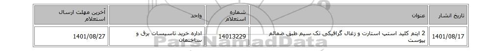 1401/08/172 ایتم کلید استپ استارت و زغال گرافیکی تک سیم طبق ضمائم پیوست14013229اداره خرید تاسیسات برق و ساختمان1401/08/27