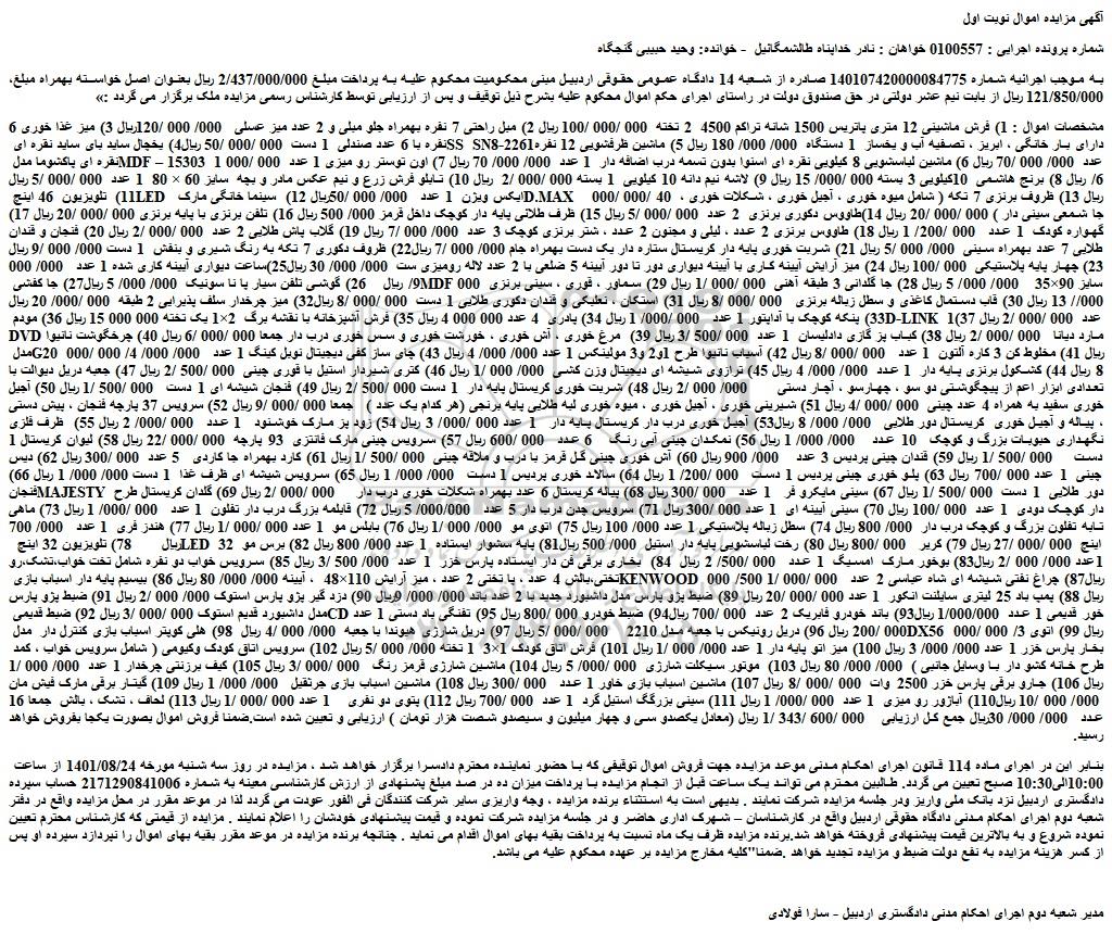 بنابر این در اجرای ماده 114 قانون اجرای احکام مدنی موعد مزایده جهت فروش اموال توقیفی که با حضور نماینده محترم دادسرا برگزار خواهد شد ، مزایده در روز سه شنبه مورخه 1401/08/24 از ساعت 10:00الی10:30 صبح تعیین می گردد. طالبین محترم می تواند یک ساعت قبل از انجام مزایده با پرداخت میزان ده در صد مبلغ پشنهادی از ارزش کارشناسی معینه به شماره 2171290841006 حساب سپرده دادگستری اردبیل نزد بانک ملی واریز ودر جلسه مزایده شرکت نمایند . بدیهی است به استثناء برنده مزایده ، وجه واریزی سایر شرکت کنندگان فی الفور عودت می گردد لذا در موعد مقرر در محل مزایده واقع در دفتر شعبه دوم اجرای احکام مدنی دادگاه حقوقی اردبیل واقع در کارشناسان – شهرک اداری حاضر و در جلسه مزایده شرکت نموده و قیمت پیشنهادی خودشان را اعلام نمایند . مزایده از قیمتی که کارشناس محترم تعیین نموده شروع و به بالاترین قیمت پیشنهادی فروخته خواهد شد.برنده مزایده ظرف یک ماه نسبت به پرداخت بقیه بهای اموال اقدام می نماید . چنانچه برنده مزایده در موعد مقرر بقیه بهای اموال را نپردازد سپرده او پس از کسر هزینه مزایده به نفع دولت ضبط و مزایده تجدید خواهد .ضمنا"کلیه مخارج مزایده بر عهده محکوم علیه می باشد.