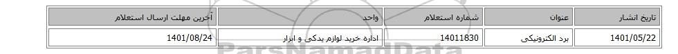 | 1401/05/22 | برد الکترونیکی | 14011830 | اداره خرید لوازم یدکی و ابزار | 1401/08/24 |