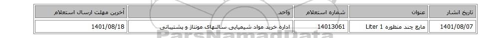 | 1401/08/07 | مایع چند منظوره 1 Liter | 14013061 | اداره خرید مواد شیمیایی سالنهای مونتاژ و پشتیبانی | 1401/08/18 |