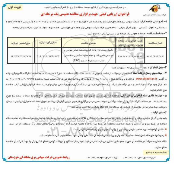 مناقصه تکمیل پست 132.33 کیلوولت ملت شامل طراحی و مهندسی، تامین کالا و انجام عملیات تکمیلی ساختمانی ؟