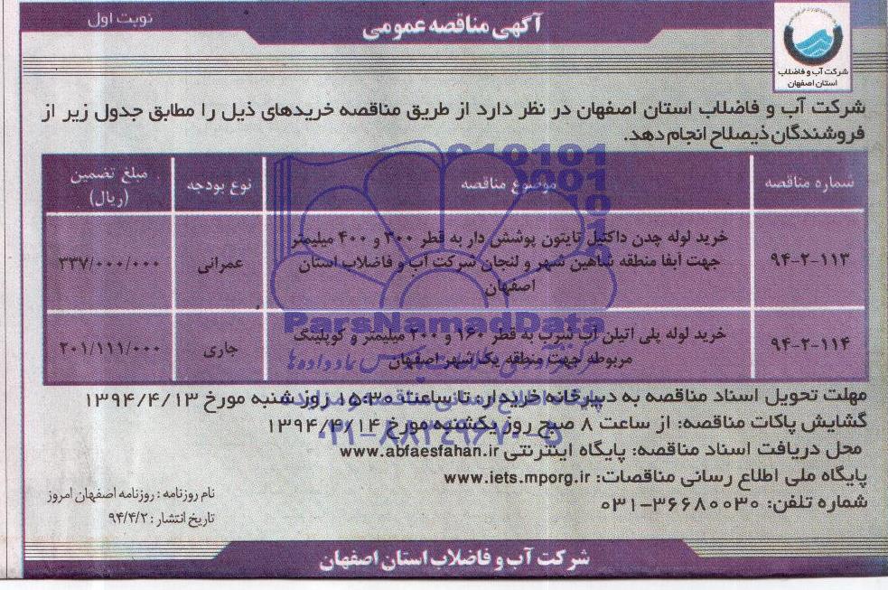 شرکت آب و فاضلاب استان اصفهان در نظر دارد از طریق مناقصه خریدهای ذیل را مطابق جدول زیر از فروشندگان ذیصلاح انجام دهد.