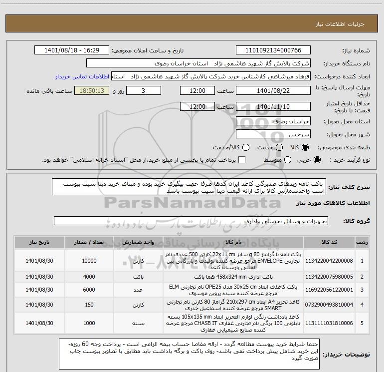 شرح کلی نیاز: پاکت نامه وپدهای صدبرگی کاغذ ایران کدها صرفا جهت پیگیری خرید بوده و مبنای خرید دیتا شیت پیوست است واحدشمارش کالا برای ارائه قیمت دیتا شیت پیوست باشد