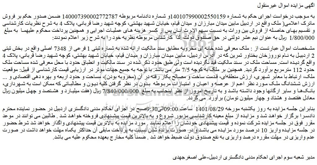 به موجب درخواست اجرای حکم به شماره 140107990002550159و شماره دادنامه مربوطه 140007390002772787 ضمن صدور حکم بر فروش ماترک اعلامی( ملک واقع در اردبیل مابین میدان مبارزان و میدان قیام، خیابان شهید بهشتی، کوچه شهید رضا قربانی، پلاک 4 به شرح نظریات کارشناسی و تقسیم بهای حاصله از فروش بین وراث به نسبت سهم الارث آنان پس از کسر هزینه های عملیات اجرایی و همچنین پرداخت محکوم علیهما به مبلغ 1/800/000 ریال به عنوان نیم عشر دولتی در حق صندوق دولت .لذا کارشناس مربوطه نظریه خود را به شرح زیر اعلام نمودند: