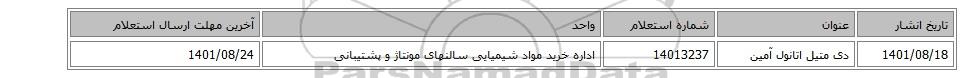 | 1401/08/18 | دی متیل اتانول آمین | 14013237 | اداره خرید مواد شیمیایی سالنهای مونتاژ و پشتیبانی | 1401/08/24 |