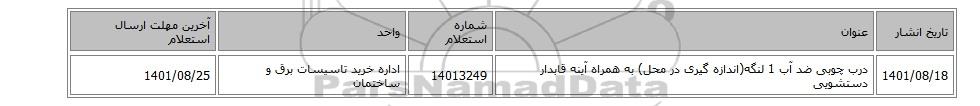 1401/08/18درب چوبی ضد آب 1 لنگه(اندازه گیری در محل) به همراه آینه قابدار دستشویی14013249اداره خرید تاسیسات برق و ساختمان1401/08/25