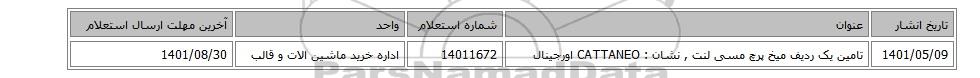 | 1401/05/09 | تامین یک ردیف میخ پرچ مسی لنت , نشان : CATTANEO اورجینال | 14011672 | اداره خرید ماشین الات و قالب | 1401/08/30 |