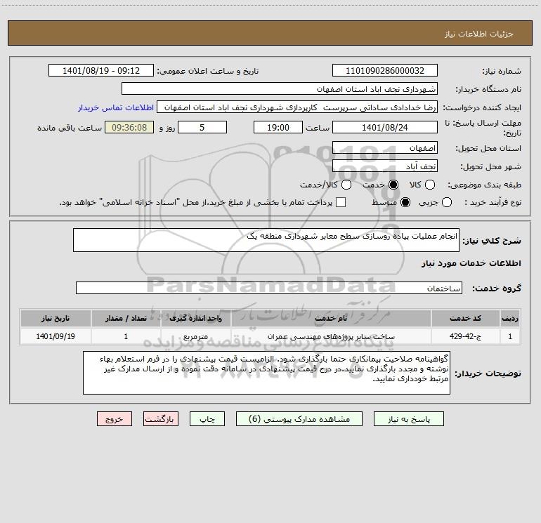 شرح کلی نیاز: انجام عملیات پیاده روسازی سطح معابر شهرداری منطقه یک