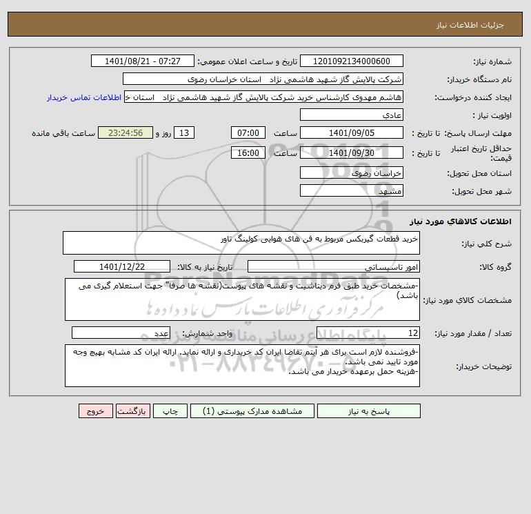 نام دستگاه خریدار:شرکت پالایش گاز شهید هاشمی نژاد استان خراسان رضوی
