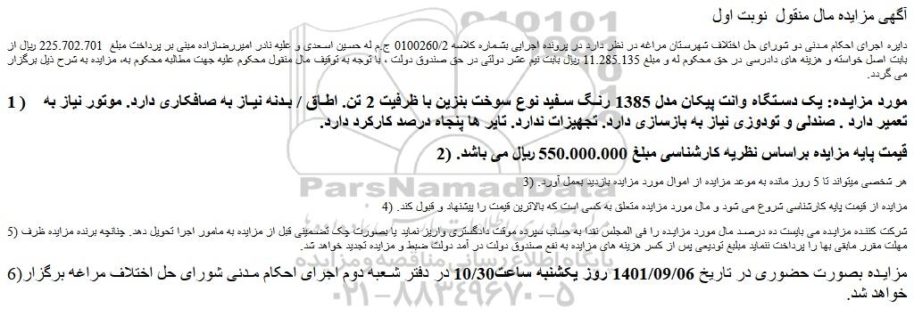 دایره اجرای احکام مدنی دو شورای حل اختلاف شهرستان مراغه در نظر دارد در پرونده اجرایی بشماره کلاسه 0100260/2 ج.م له حسین اسعدی و علیه نادر امیررضازاده مبنی بر پرداخت مبلغ 225.702.701 ریال از بابت اصل خواسته و هزینه های دادرسی در حق محکوم له و مبلغ 11.285.135 ریال بابت نیم عشر دولتی در حق صندوق دولت ، با توجه به توقیف مال منقول محکوم علیه جهت مطالبه محکوم به، مزایده به شرح ذیل برگزار می گردد.
