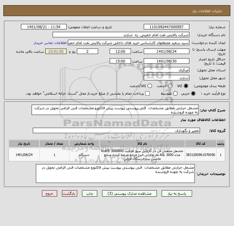 شرح کلی نیاز: مشعل حرارتی مطابق مشخصات فنی پیوستی پیوست پیش فاکتورو مشخصات فنی الزامی تحویل در شرکت به عهده فروشنده