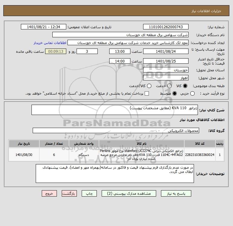 شرح کلی نیاز: ژنراتور 110 KVA (مطابق مشخصات پیوست)