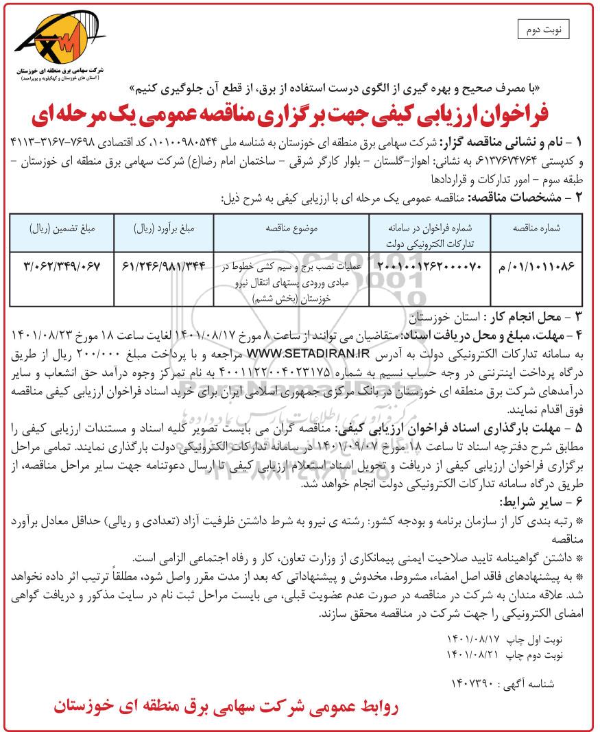 | 1011086/ 01 / م | 2001001262000070 | عملیات نصب برج و سیم کشی خطوط در مبادی ورودی پستهای انتقال نیرو خوزستان بخش ششم | 61.246.981.344 | 3.062.349.067 |