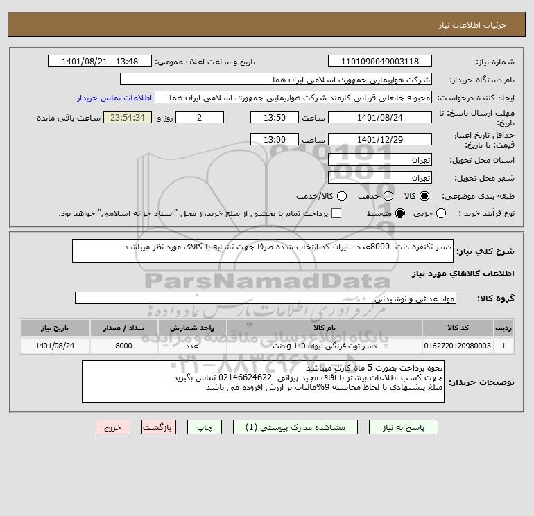 شرح کلی نیاز: دسر تکنفره دنت 8000عدد - ایران کد انتخاب شده صرفا جهت تشابه با کالای مورد نظر میباشد