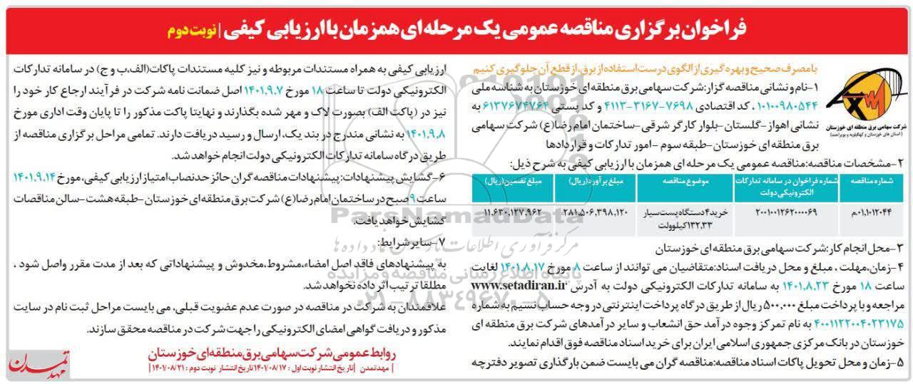 | 01/1012044/ م | 2001001262000069 | خرید 4 دستگاه پست سیار 132/33 کیلوولت | 281.506.398.120 | 11.630.127.962 |
